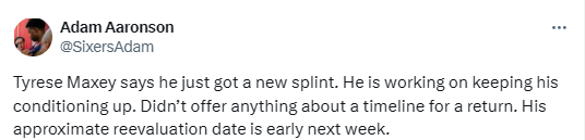 马克西表示他刚换上了新的固定护具,目前正在努力保持身体状态。他并未透露具体的复出时间表,预计下周初会重新评估伤情。