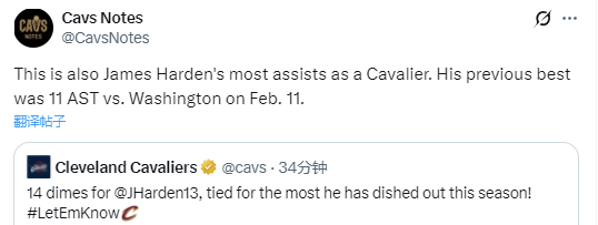 哈登此役得到17分5篮板14助攻,单场14次助攻,创造了哈登骑士生涯单场助攻数新高,同时也追平了哈登本赛季单场最高助攻数。