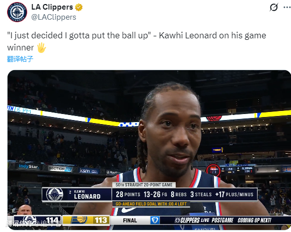 北京时间3月28日,NBA常规赛快船114-113险胜步行者,快船在客场完成24分大逆转,小卡全场26投13中轰下28分8篮板4助攻3抢断,正负值+17,贡献0.4秒中投准绝杀;小卡连续50场20+再创生涯新高,历史首位30岁后达成如此成就的球员。