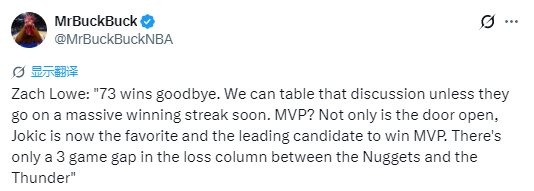 “MVP之争也彻底变天:大门已然敞开,约基奇如今成了头号热门和领跑者。掘金与雷霆的负场只差3场,这事咱们后续再聊。”