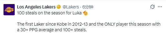 根据湖人官方统计数据显示,东契奇本赛季抢断数已达到100次。他是自2012-13赛季科比之后首位达成此成就的湖人球员,也是本赛季唯一场均得分30+且抢断100+的球员。