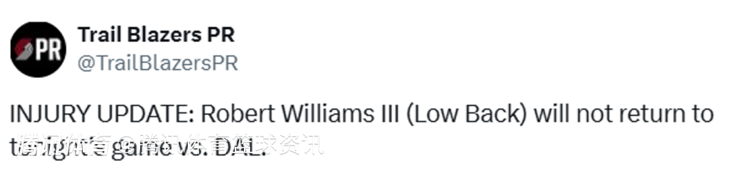 北京时间3月28日,NBA常规赛,开拓者主场对阵独行侠,开拓者官方宣布,罗威因为下背部伤势退出比赛,本场比赛不会回归。