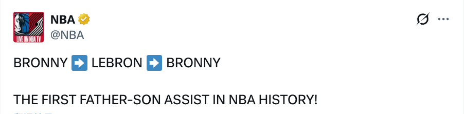 北京时间3月28日,NBA常规赛,湖人主场对阵篮网,第二节还剩下7分多钟的时候,詹姆斯助攻布朗尼命中三分球,完成了NBA历史首次父子连线。