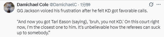 “裁判对某些球员的偏袒程度简直离谱。杜兰特是史上最佳球员之一,这点我尊重他,但我们其他球员也和他一样在拼命打球,一样在为比赛付出。”