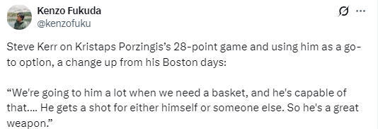在谈到波尔津吉斯的表现时,科尔说道:“当我们需要得分时,会大量把球交给他,他完全有能力扛起这个重任,他既能自己出手,也能为队友创造机会。所以他是我们非常重要的得分武器。波尔津吉斯带来的球场空间极具价值。此外,在某些方面,我们必须重新让球员理解比赛时间与比分的重要性。”