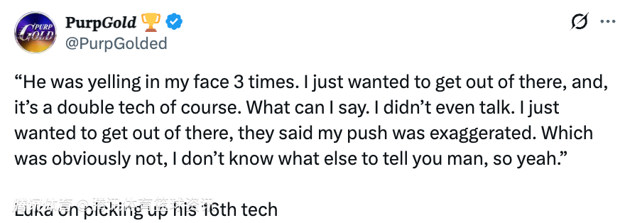 谈及自己本场比赛吃到本赛季第16次技犯,东契奇表示:“他(扎威)当着我的面吼了三次。我当时就只想赶紧离开那里,结果就被吹了双方技术犯规,这是肯定的。我能说什么呢?我连话都没说,就只想躲开他而已。他们说我的推搡动作是夸大表演,这明显不是啊。我真不知道还能说什么了,兄弟,就这样吧。”