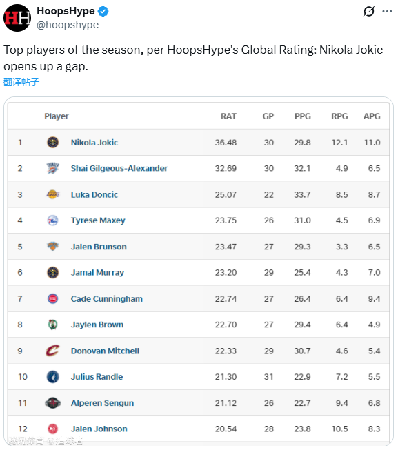 根据美媒HoopsHype统计,约基奇的RAT值高达36.48,同样大幅领先位居联盟之首,亚历山大32.69排在联盟第二位; RAT值是一种高阶数据,是一种综合考量球员在得分、篮板、助攻、抢断、盖帽等方面的贡献和效率的指标。