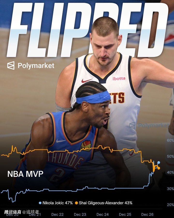 据Polymarket数据显示,约基奇夺得MVP的概率升到47%,已经超越亚历山大;过去6场比赛,亚历山大的状态下滑且雷霆2胜4负,期间三次输给马刺。