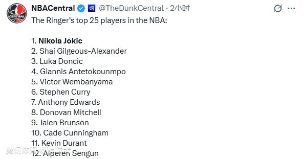 美媒The Ringer评选当今联盟25大球星,排在前十的球星依次是1、约基奇;2、亚历山大;3、东契奇;4、字母哥;5、文班亚马;6、库里;7、爱德华兹;8、米切尔;9、布伦森;10、坎宁安,杜兰特排在第11位,詹姆斯则是排在第24位。