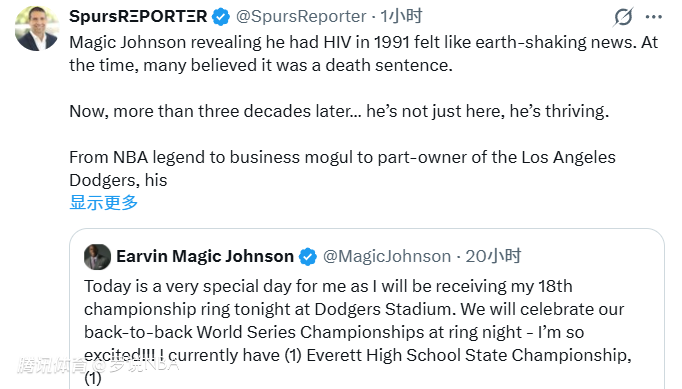 NBA记者加尔扎转发了魔术师的这番言论,并配文写道:“1991年魔术师约翰逊公开自己感染HIV的消息,在当时无异于晴天霹雳。那时很多人都认为,这等同于一纸死亡判决。三十多年过去,他不仅好好活着,而且活得无比精彩。从NBA传奇,到商业巨头,再到洛杉矶道奇队股东,他的人生早已超越篮球本身。这也见证了医学的进步、认知的普及,以及人性韧性的伟大。”