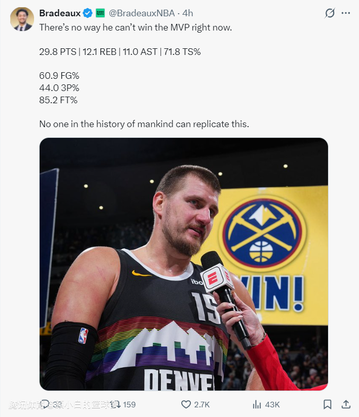 火箭记者Bradeaux晒出约基奇场均29.8分12.1篮板11助攻,真实命中率71.8%的数据写道:他不拿常规赛MVP天理难容。