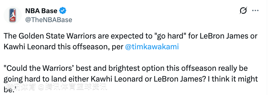 北京时间3月28日,据记者Tim Kawakami报道,金州勇士队预计会在今年休赛期全力追逐勒布朗-詹姆斯或莱昂纳德。