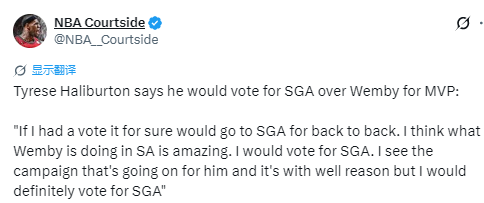 哈利伯顿表示,若有MVP投票权,他会将票投给亚历山大而非文班亚马:“如果我有投票权,那肯定会投给亚历山大,支持他蝉联MVP。我认为文班亚马在马刺队所做的一切令人惊叹。但我会投给亚历山大。我看到了文班亚马的发言,这是有充分理由的,但我肯定会投给亚历山大。”