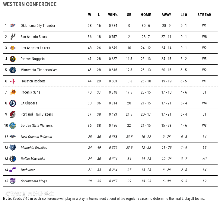西部雷霆与马刺将争夺联盟第一的榜首位置,湖人的西部第三位置还不保险。西部前六球队基本确定,而附加赛后三名的排名还存在不小的悬念。