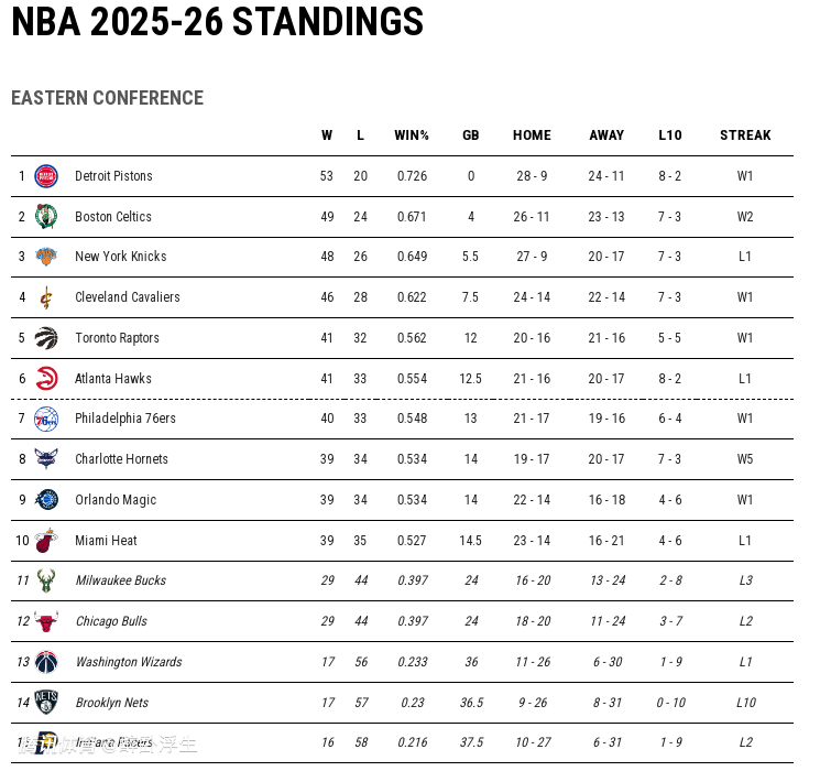 东部目前活塞稳居榜首,前四名的球队相对清晰,东部前六直通名额依然存在悬念。
