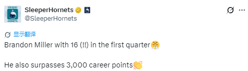 比赛第一节战罢,米勒出战12分钟,投篮8中5,三分5中3,罚球3中3,得到16分2篮板。根据数据统计显示,他职业生涯累计得分就此达到3000分。