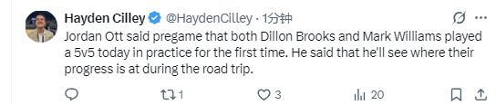 奥特表示:“狄龙-布鲁克斯和马克-威廉姆斯今日均参加了5对5对抗训练,这是两人即将复出的重要一步。”