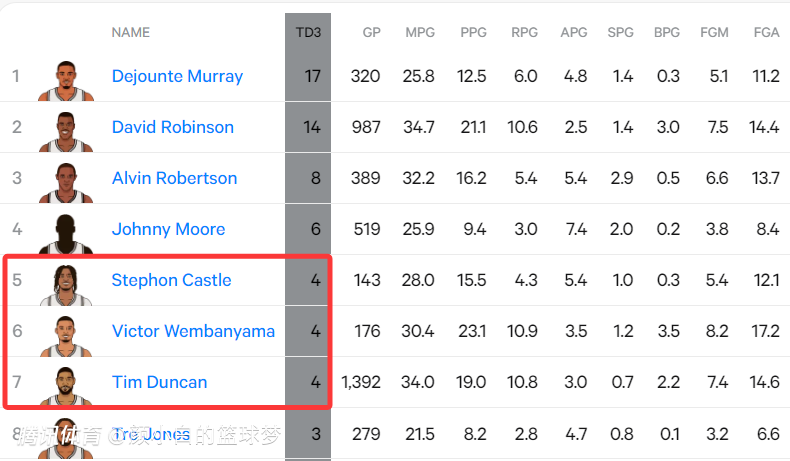 3.卡斯尔单赛季4次三双是联马刺队史第二多,第一多是德章泰-穆雷13次;