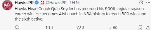 北京时间3月29日,NBA常规赛继续进行,老鹰队123-113击败国王队。凭借本场胜利,老鹰队主教练奎因-斯奈德拿到了常规赛执教生涯的第500场胜利。