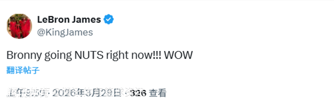 北京时间3月29日,G联赛常规赛,南湾湖人以140-132击败苏瀑天空力量,此役布朗尼发挥出色,全场拿到26分7篮板5助攻,命中6个三分球刷新生涯新高。而在比赛中,詹姆斯也更新社媒,盛赞自己的大儿子。