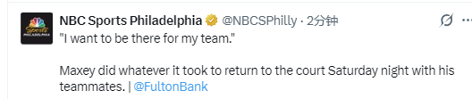 北京时间3月29日,NBA常规赛继续进行,76人队118-114击败黄蜂队。马克西此役复出,18投10中得到26分7篮板8助攻1抢断1盖帽,在场正负值+13。赛后,他接受媒体采访,谈到了复出后的感受。