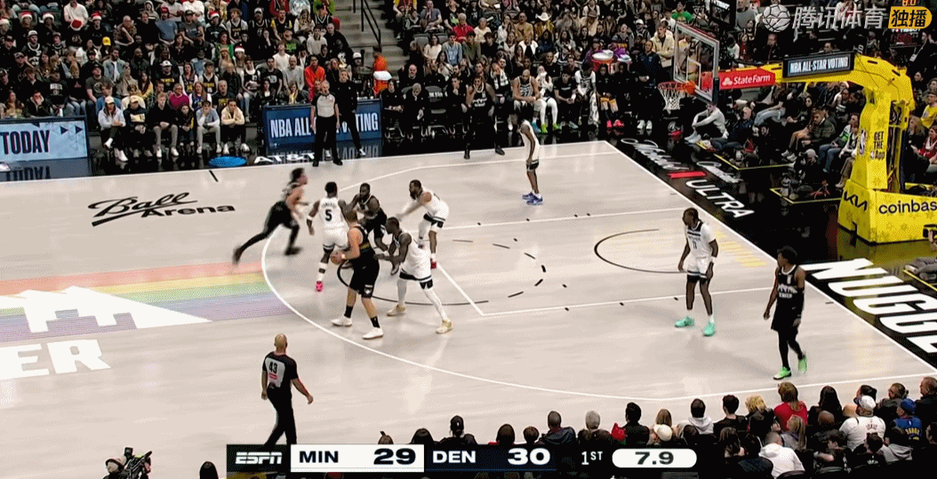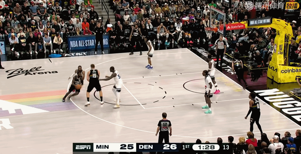 没有必要再去赘述约基奇的得分能力,我们看看他的无形贡献。在这个回合中,约基奇给队友设置扎实掩护,为什么兰德尔协防到一半不动了?约基奇的恐怖牵制力。