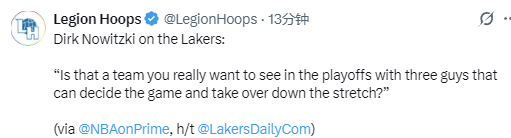 北京时间3月29日,前NBA球员诺维茨基在节目中谈到了湖人队,他警告其他球队,季后赛中的湖人队不可小觑。