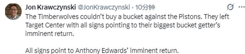 该记者写道:“种种迹象表明,爱德华兹将在对阵独行侠的比赛中复出,在季后赛临近之际,为森林狼注入急需的强心剂。本周,爱德华兹一直在球队训练馆进行个人训练,且获得球队许可,参与全部篮球活动。在正式获批出战比赛前,他仍需完成训练、参加投篮热身,但他的队友们在离开标靶中心时(输给活塞后),都坚信很快就能看到他身披战袍登场。”