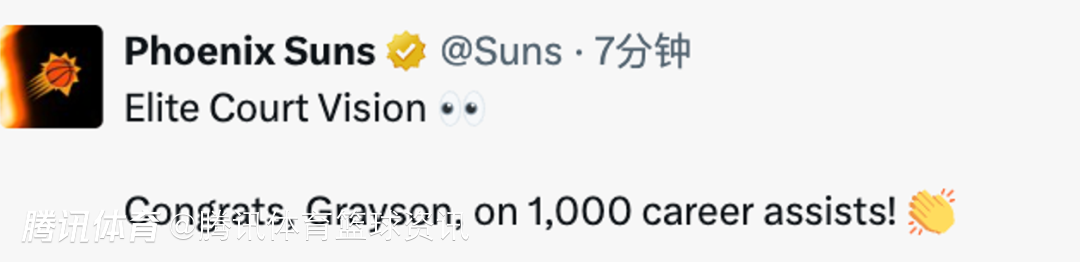 北京时间3月29日,NBA常规赛,太阳坐镇主场对阵爵士,本场比赛太阳球员格雷森-阿伦迎来里程碑。