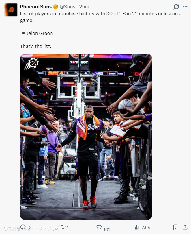 3.格林22分钟拿到30+,他是太阳1968年建队后最快30+的球员;