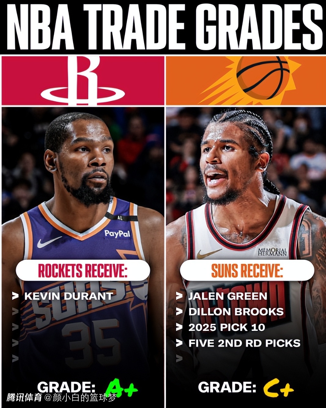 都说火箭队送出格林、狄龙、26年10号签、5个次轮签换到杜兰特是A+的交易,可本赛季火箭战绩44胜29负,而上赛季火箭52胜30负西部第二。上赛季太阳战绩已经41胜33负西部第七而太阳上赛季36胜46负西部第11,从这个方面来看这笔交易的赢家实际上是太阳 。