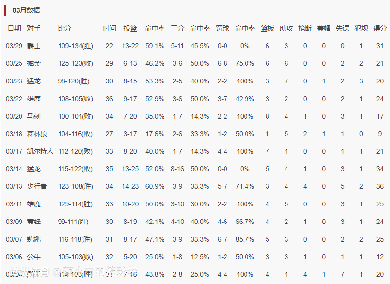 杰伦-格林整个三月份的状态呈现回暖的趋势,这个月14场比赛有11场20+与三场30+,这个月杰伦-格林场均31.3分钟,拿到22.2分4.2篮板3.4助攻1.1抢断0.2盖帽,命中率43.8%,三分命中率33.3%。(最近四场比赛都拿到20+且只有一场命中率不足五成)