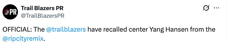 北京时间3月30日,开拓者官方宣布,球队已经从G联盟附属球队混音队召回杨瀚森。