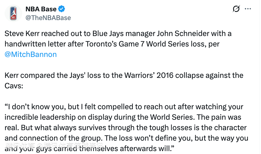 科尔将蓝鸟队的这次失利,比作2016年勇士对阵骑士的那次崩盘:“我们素未谋面,但看完你在世界大赛中展现出的非凡领导力后,我觉得必须和你说些什么。那种痛苦是真实的。但真正能在惨痛失利中留存下来的,是团队的品格与凝聚力。这次失败不会定义你,但你和你的队员们在失利后展现出的姿态,会永远被铭记。”