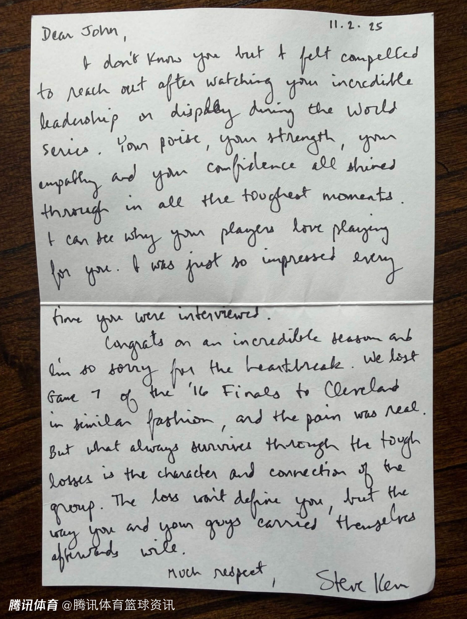 北京时间3月30日,据美记Mitch Bannon报道,在去年MLB多伦多蓝鸟队输掉世界大赛抢七战后,勇士主帅科尔向蓝鸟队主帅约翰-施耐德寄去了一封手写慰问信。