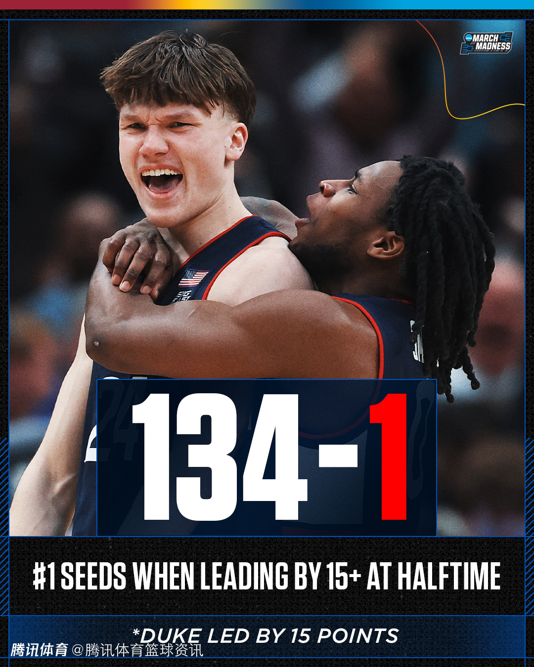 另据统计显示,杜克大学成为NCAA疯狂三月历史中第一支半场领先15+却输球的头号种子,此前纪录为134胜0负。杜克上半场44-29领先15分。
