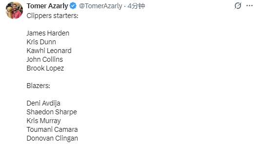 北京时间12月27日,NBA常规赛继续进行,开拓者队对阵快船队。赛前,双方公布了本场比赛的首发阵容。