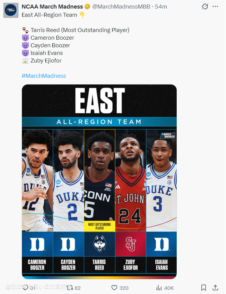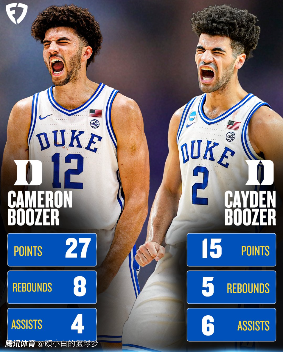 卡梅隆-布泽尔与弟弟凯登也入选了东部联盟的最佳阵容,只可惜他们无法去争夺今年的NCAA冠军了。