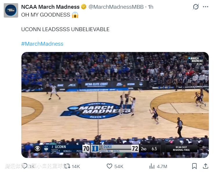 北京时间3月30日,NCAA疯狂三月精英八强赛,杜克大学72-73惜败康涅狄格大学。这场比赛杜克上半场还领先康大13分之多,没想到下半场杜克核心们纷纷哑火,最终在决胜时刻出现了低级的失误,康大用一个logo的超远三分绝杀成功。