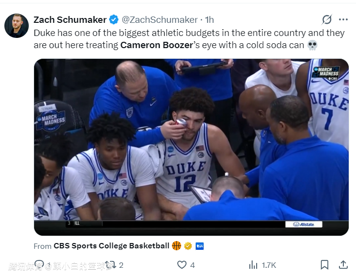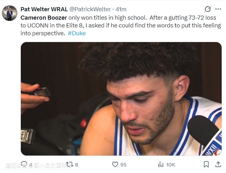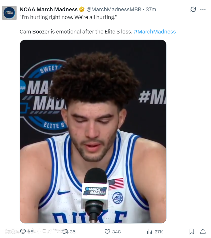 这场比赛状元热门的卡梅隆-布泽尔的弟弟凯登-布泽尔贡献了整场最惨烈的一次失误,终场前6.5秒杜克还领先2分,结果凯登失误送了球权,康大核心马林斯接到球。