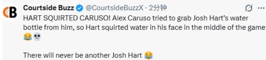 从慢动作回放来看,当时哈特坐在场下,正在张开双手质疑判罚,而卡鲁索恰好在他的身边,试图拿走哈特手中的水壶,但哈特躲开了卡鲁索,随后顺势用水壶呲水,喷了卡鲁索一脸。
