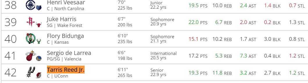 从选秀网站的预测来看,这位老鸟的选秀顺位并不高,从次轮42顺位-38顺位浮动,疯三这个表现还不进首轮吗?