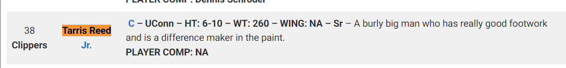 NBA记者肯尼-史密斯为他抱不平,他说:我有种感觉,不管里德被哪支球队选中,他都会成为本次选秀中最出色的中锋之一。他充满活力,篮板球能力极强还能护筐,内线技术娴熟,投篮手感柔和,还有一定的传球能力,他会是出色的球员。