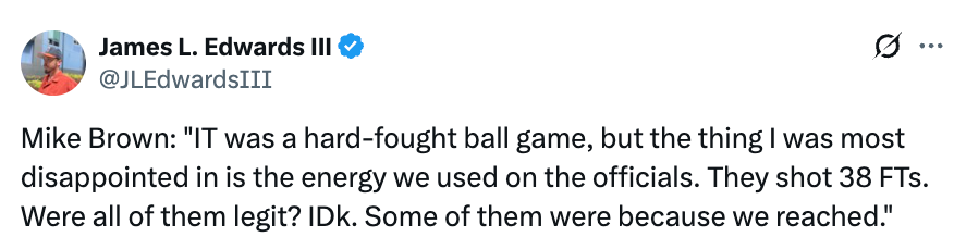谈到自己吃到技犯,布朗表示:“我吃这个技犯主要是想向队员们表明,我会尽力护着大家,但赢球输球从来不是靠这种方式。我会和你们站在一起。我们这支队伍,今晚表现得很明显 ——总爱跟裁判抱怨太多。如果我们觉得冲裁判大喊大叫、浪费时间和精力去跟裁判争执就能改变他们的判罚想法,那根本行不通。”