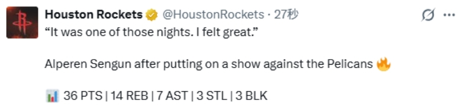 北京时间3月30日,NBA常规赛继续进行,火箭队134-102大胜鹈鹕队。本场比赛,火箭队球员申京23投12中(三分球7投5中)得到36分14篮板7助攻3抢断3盖帽。赛后,申京接受媒体采访。