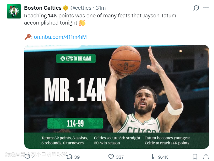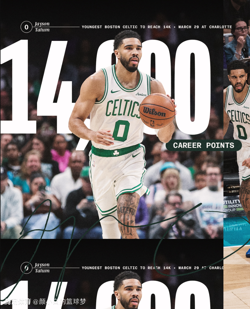 这场比赛是杰森-塔图姆职业生涯14000分里程碑,但也不只是1.4万分里程碑,凯尔特人官方晒出了塔图姆与绿凯更多的纪录。