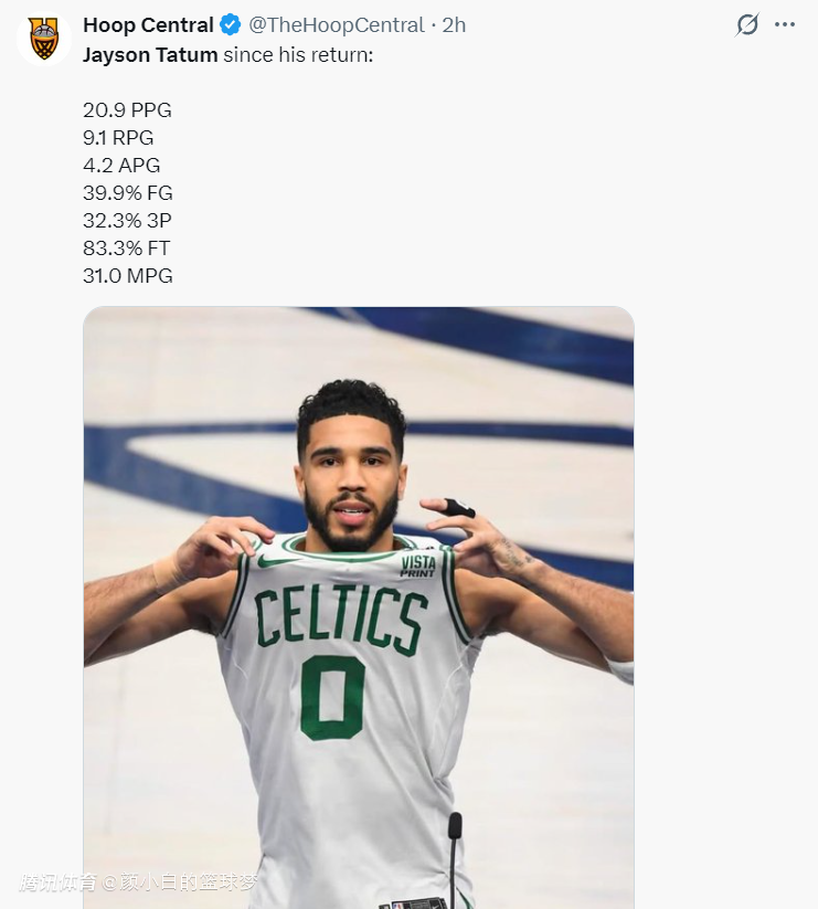 塔图姆本赛季复出的11场比赛绿凯拿到9胜2负,塔图姆场均31分钟,拿到20.9分9.1篮板4.2助攻1.1抢断0.2盖帽,命中率39.9%,三分命中率32.3%,虽然效率还是不佳但数据已经恢复到接近20+10+5。