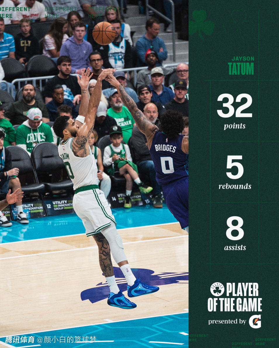 绿凯官方晒出纪录:1.塔图姆赛季新高的32分,也是本赛季首次30+,上一次30+是去年5月13日季后赛的42分;