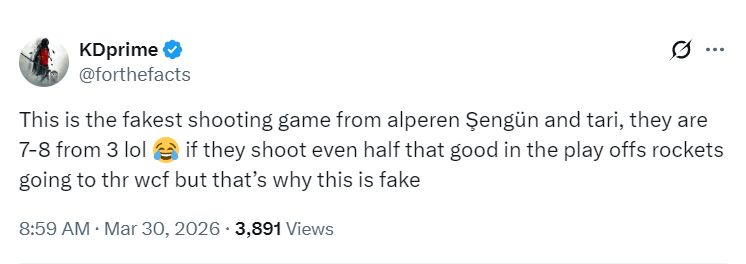 KD的球迷:这就是申京与伊森最虚假的投篮游戏,他们居然命中了7-8个三分球太假了。哈哈哈,如果他们能在季后赛有这样一半的三分投射水平,火箭可能能赢得总冠军,正因如此这场比赛才太虚假了。