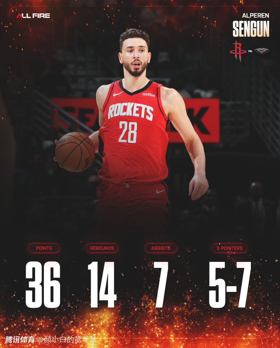 申京此役全场比赛32分钟,23中12,三分7中5,拿到36分14篮板7助攻3抢断3盖帽0失误,命中率52.2%,三分命中率71.4%,真实命中率67.9%。申京5个三分追平生涯单场最多。